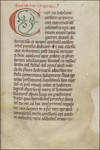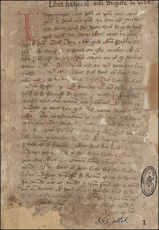 Ex libris on f.1r for Hospital sancte Brigitte de Urbe, includes some glossing in German