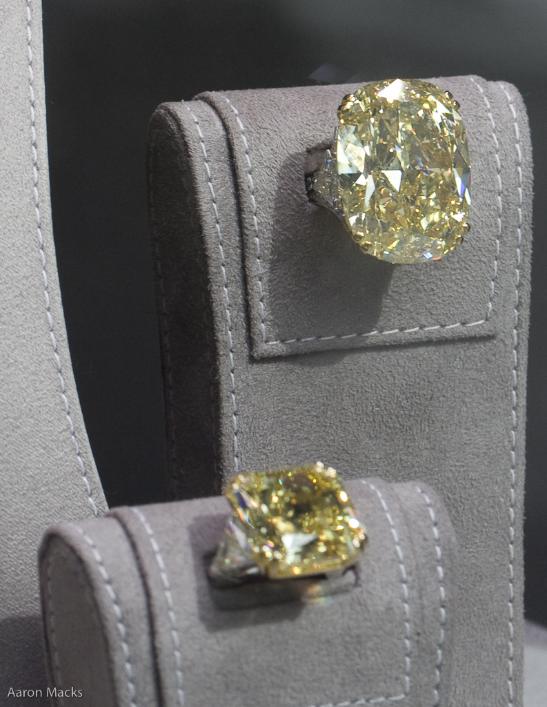 pair of yellow diamond rings in the windows of Graff Jewelers, Madison Ave, NYC