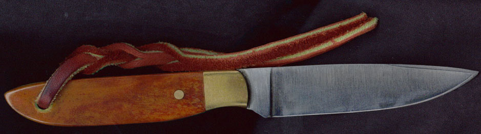This a Mark Nevling drop-point in 52100. It's one of his older pieces, and isn't prefect, but an interesting piece, and one I'm not afraid to use. The handles are smooth bone and the dangler sheath(not shown) is leather. Sadly this piece was lost when it accidentally went into security at Logan Airport in the fall of 2005 and never escaped.