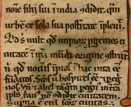 That allows us to transcribe the script as follows: Primus ante diluvium Cain civitatem Enoch nomine filii sui in India condidit quam urbem ex sola sua posteritate in plevit, quod sibi vult, quod impiorum progenies civitatem in ipsa mundi origine construxit? nisi quod noveris impios in hac vita esse fundatos, sanctos vero hospites esse et peregrinos. Unde et Abel tamquam peregrinus in terra populus Christianus non condidit civitatem; superna enim est sanctorum civitas.