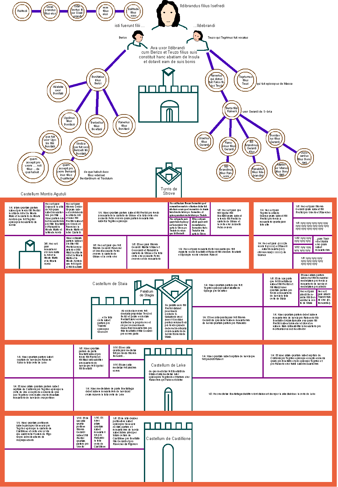 I have created a digital sketch of the document (PNG below, zoomable detailed version on my website). The colours were arbitrarily chosen, since this version was made from black and white photographs. For a better idea of how Hildebrand and his two sons, Berizo and Teuzo, are supposed to have looked, see the original (link below, with caveat). The orange-bordered panels represent the ownership shares in six blocks of property: