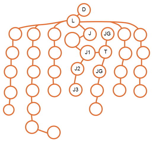 I have left out the text and instead used letters to mark the characters. Here, J is Judah, J1 and J2 are his first and second sons Er and Onan, and T is Tamar. Her twin children are marked JG, since the text marks them as sons of Judah and ambo gemini. Having the two twins arrayed in symmetry either side of their mother is a neat trick.