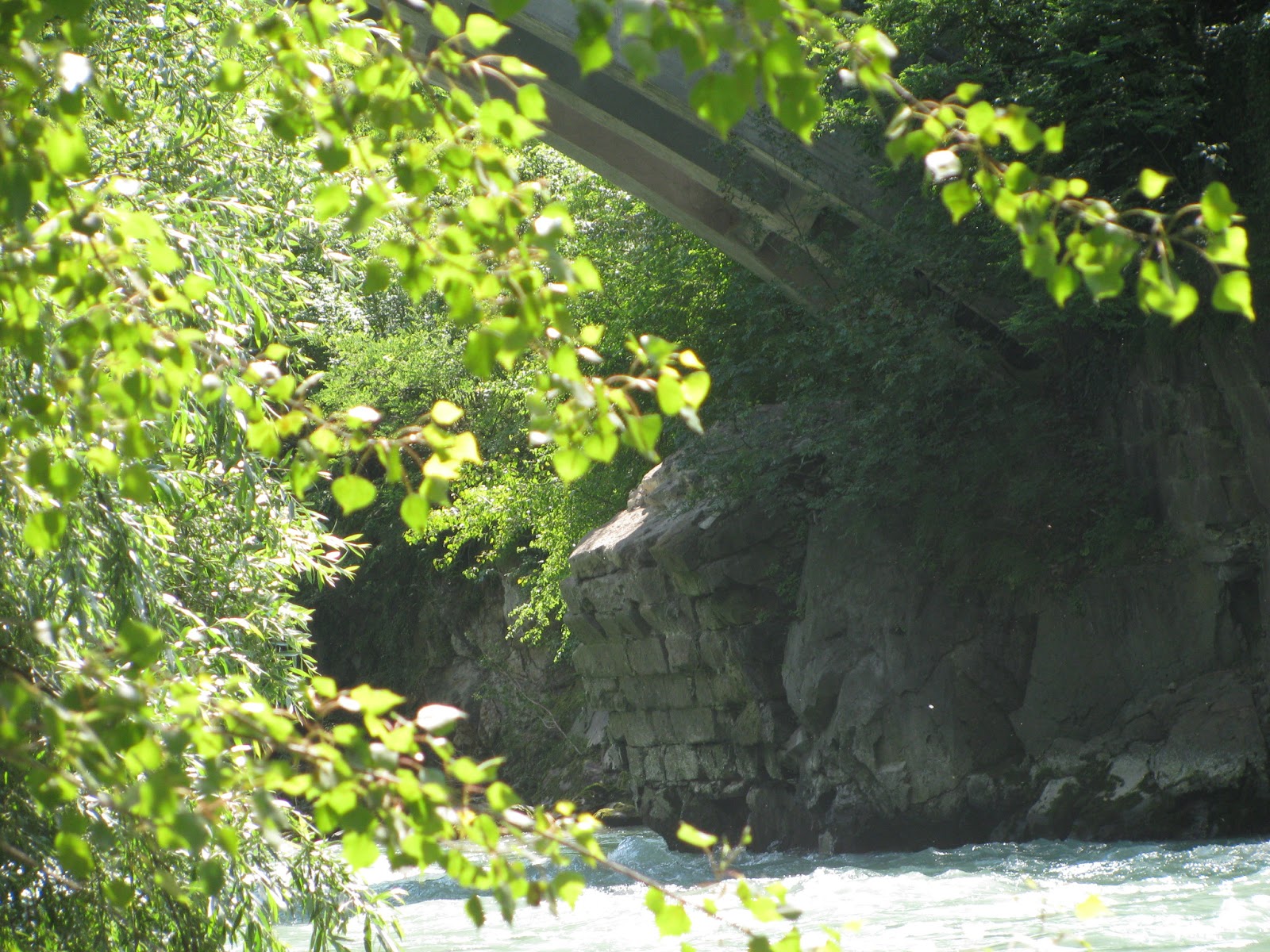 The next picture shows the structure, with the arch of a 20th-century concrete bridge above it. The remains are in shadow at the centre of the picture. It might have been better to wait all day until the sunlight was not so bright and then take a picture, but my dear wife and son came along for this expedition and we had some other pleasures such as hiking to also accomplish that day, so this picture will have to do: