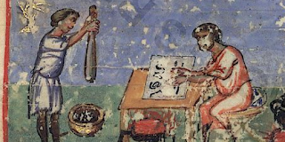 • Vat.gr.747, one of the six known illustrated Byzantine Octateuchs, full of strange and extraordinary pictures. It also contains the Letter of Aristeas, the earliest text to mention the Library of Alexandria. Here is a scene in which a mortar and pestle are used as a painter is at work, folio 114r