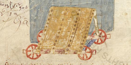 The seven manuscripts digitized and released April 1 by Digita Vaticana include an important 11th-century codex explaining and illustrating contemporary Byzantine military technology, Vat. gr. 1164 (link below). Here is an armoured vehicle that let attackers approach a wall, presumably to work to undermine it, defying boiling oil and stones from above.