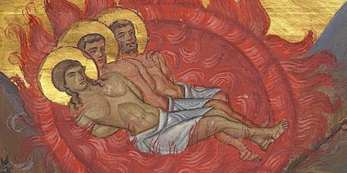 The image here shows Fausta (a 13-year-old girl), the sage Evilasius and the eparch Maximus being boiled alive in a cauldron for their faith: