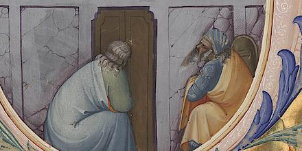 - Ross.1192, scrapbook of illuminations cut from a music manuscript, including the two gents peeping through a crack in the door below