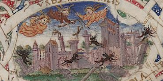 Here is a drawing of devils flying around evil idolatrous Rome from Borgh.366, folio 1r