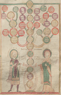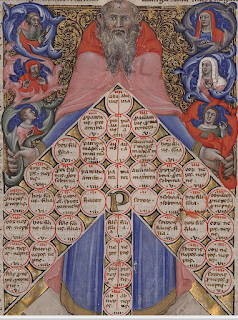 - Pal.lat.622, a 13th-century Decretum Gratiani text, with the sculptural figure below (fol. 240v) at the head of a Schadt Type 5A Roman-style arbor consanguinitatis. There has always been some disagreement about who the wise old figure holding the tray of prohibited marriages represents, because there are no contemporary explanations. Is he a personification of tradition? Or God the Father as judge? Or someone too old to marry? The most general position is that he is a jurist, the wise guardian of the law, and thus Gratian himself (as I noted in a blog post two weeks ago). The version by Nicolò features an old man in rich robes of authority. We know effectively nothing about Gratian, barring his evident status as a law professor of 12th-century Bologna, so even a century afterwards, artists could make of him what they liked.