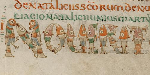 The colourful miniatures of this codex, probably made at Paris, comprise elaborate crosses and ingenious animal lettering. Most other surviving Merovingian codices are quite plain with no illumination, but the sacramentaries are something special. There's an even more elaborate one, Latin 12048, at Paris (hat tip to Mare Nostrum for alerting me to this). Here is how the Vatican codex treats the word "noverit" on folio 132r, assembling it out of birds and fish:
