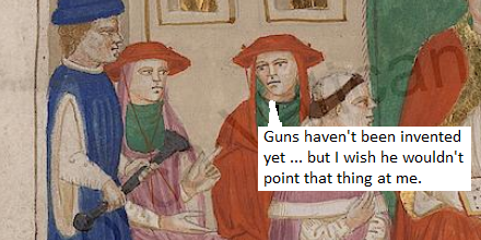 The first consideration is whether it might be a gun. The first firearm in Europe was the arquebus, and I read that it was employed in the army of Matthias Corvinus, which might get us back to a date of 1460. But this image long predates that, and in any case the object does not have a hook, which is essential to cope with gun recoil (and muzzle loading), and the bulb cannot have a function in any firearm.