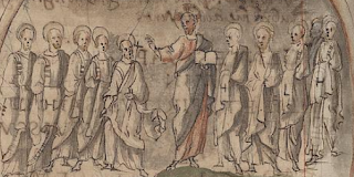 Our latest investigation concerns a curious courtroom scene possibly drawn by Nicolò da Bologna in Urb.lat.160 at folio 5r. I introduced this manuscript in November 2015 when it was brought online by Digita Vaticana. The St Louis catalog discusses the codex in some detail, as does Stornajolo's Codices Urbinates Latini, Codices 1-500, pp 166-167.