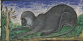 Here's a silly monkey that thinks it can hide behind a tiny and leafless tree (detail of folio 1r of Urb. lat.373):