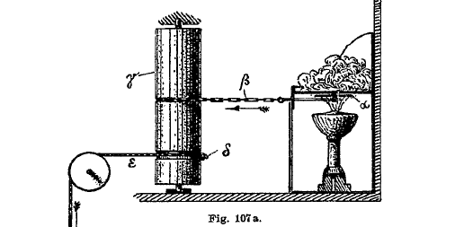 I actually had far more difficulty matching Schmidt's drawings to those in the manuscripts than I was expecting to have. After some fumbling, I have gathered here images of one of Heron's devices, a kind of mechanical dimmer switch which allows a flame to gradually flare up, which turns out to be Schmidt figure 107. Comparing this to the manuscripts, one sees how peremptory he was in simply inventing a whole new figure:
