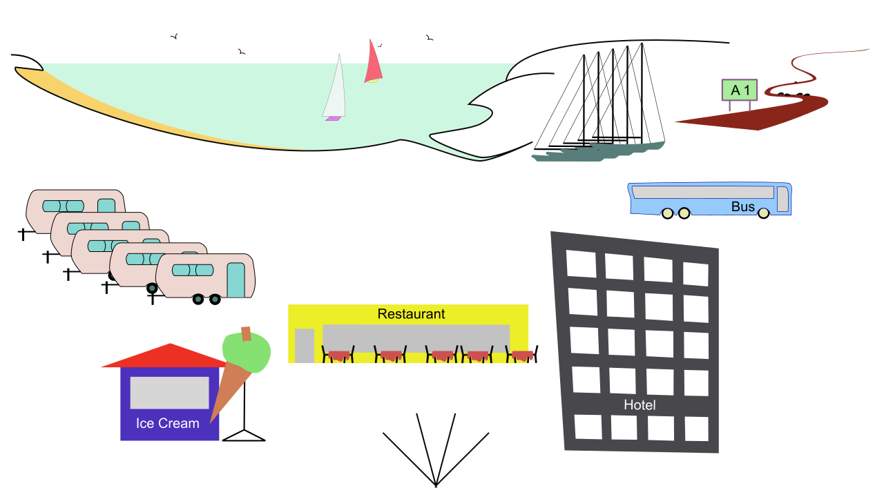 As you walk around the village, you discover a caravan park behind the ice-cream joint and a bus-stop past the hotel.