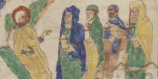 There is something for everyone in this bible. It is full of colourful, slightly naive art, such as this sketch of the wise virgins who wait indoors at folio 369v