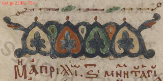 The plaited headbands and initials chiefly served to help celebrants find their places when using this codex as a lectionary. It dates from the period when Greek was still the common language in Calabria and other parts of the Italian south. Pressed by Arab incursions and economic instability, a religious leader, Neilos of Rossano, relocated north by stages to Grottaferrata near Rome.