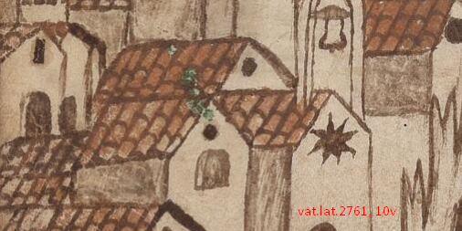 All of the animals are drawn in standard, unpretentious profile poses. Those standing on their hind legs are quite similar in overall form. [These two] are not merely similar, but almost identical. All one needed to do to transform the deer at top into the hare below was to replace the antlers with ears. One is tempted to think that the artist employed instructions from a model book that explained how to draw any number of animals with minimal change.The pictures are undoubtedly interesting, though, showing garments and architecture of the 14th century in great detail, for example a contemporary Italian town: