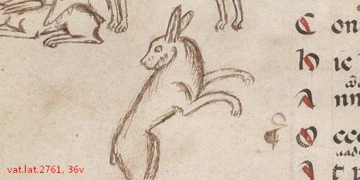 At top of the margin on folio 36v is a deer and below is a hare, illustrating the account of the hunt of Dido and Aeneas (IV, 117). John Murdoch comments in his Album of Science volume on antiquity and the Middle Ages, 204 (Scribner, 1984):