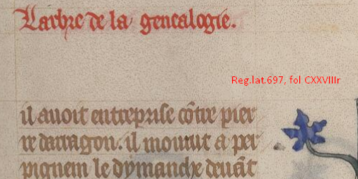 Christine Klapisch-Zuber in her major work, L'Ombre des Ancêtres, fixes the first fusion of "genealogical" and "tree" in Latin in 1312 by Bernard Gui, a Dominican inquisitor and bishop in the south of France, who wrote a history of the French kings.That means that in the latest wave of Vatican digitizations, special interest attaches to a 1369 translation of this work into French by Jean Golein.