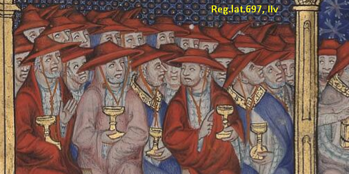 This is not Golein's autograph of course. That, according to Delisle, is in the parliamentary library in Paris. The first part of the Vatican codex contains Golein's French rendering of the Flores chronicorum, also by Bernard Gui, which is a history since the time of Jesus of the popes and Roman emperors. Reg.lat.697 is wonderfully illuminated and offers us this notable conclave of cardinals: