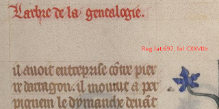 Christine Klapisch-Zuber in her major work, L'Ombre des Ancêtres, fixes the first fusion of "genealogical" and "tree" in Latin in 1312 by Bernard Gui, a Dominican inquisitor and bishop in the south of France, who wrote a history of the French kings.That means that in the latest wave of Vatican digitizations, special interest attaches to a 1369 translation of this work into French by Jean Golein.