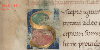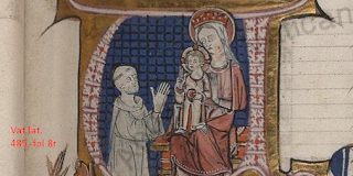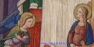 - Chig.C.VIII.230, with fine initials and miniatures including this Annunciation (though I could have sworn this angel has a horn!)
