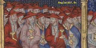 This is not Golein's autograph of course. That, according to Delisle, is in the parliamentary library in Paris. The first part of the Vatican codex contains Golein's French rendering of the Flores chronicorum, also by Bernard Gui, which is a history since the time of Jesus of the popes and Roman emperors. Reg.lat.697 is wonderfully illuminated and offers us this notable conclave of cardinals: