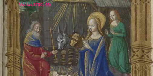 - Vat.lat.3780, a lovely 15th century book of hours, thought to have been made in Lyon. Here is August in its calendar: ... and here is the Nativity illumination: