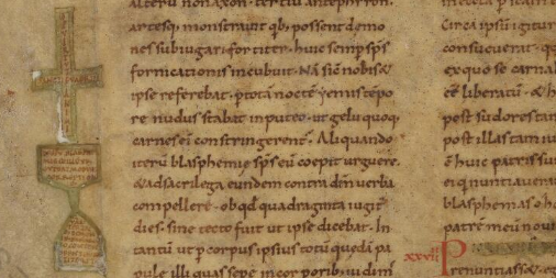 Plus a 9th-century fragment of the Lex Ribuaria. My eye was also caught by the elaborate green cross below (folio 27v) where you can read the words Sancti Evagrii horizontally and De virtute animi vertically.