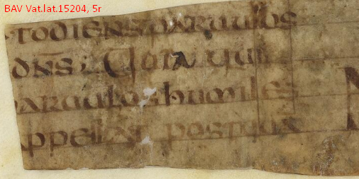 74. Vat.lat.15204, a collection of fragments, including 3r-v, 4r-v: Canonum collectio "Concordia canonum"; 5r-v Gregorius Magnus, Homiliae in Evangelia (28.2–3) from the 7th or 8th century.