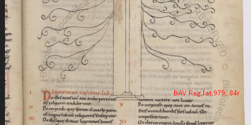 The table above had come to be called an arbor juris, a law diagram, so it was not long before the decoration began to become treelike, perhaps as a mnemonic aid to students. The completely new releases at DigiVatLib include a law book, the Decretum of Burchard of Worms, which takes the tree idea further, indicating the change in progress. Reg.lat.979 is one of the earliest codices ever to associate a tree with a table of consanguinity. Note how the Reg.lat.979 drawing below, dated about 1080, does not yet put the table in the tree. The tree simply takes root on the roof like a cheeky weed:
