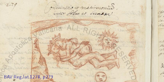 - Reg.lat.1278, a manuscript copy of the 16th-century alchemical treatise Rosary of the Philosophers. This codex postdates the book publication of 1550, a printing at Basle, Switzerland. The work (see Wikipedia) was a "rose garden" of wise sayings by those convinced they could manufacture gold, but its market success was undoubtedly more due to its ensemble of X-rated pictures.