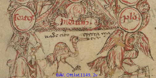 - Ott.lat.1149, a 15th-century manuscript of Boethius on the Isagoge of Porphyry with an unusual arbor porphyriana with a monkey in the crown, and animals in and around the branches. Hermann Schadt (Die Darstellungen der Arbores, p. 82) says the older arbor porphyriana drawings are simple line diagrams and this is one of the first to be made tree like. My readers know that just because something is called an arbor, it need not look like a tree. The association is simply that arbor is a medieval word for a recursive diagram (perhaps because trees preserve shape during growth). Also, as Schadt notes on page 81, this may be a pun in the Visigothic language, where arbi meant inheritance, hence the word-play arbor juris for an inheritance diagram.
