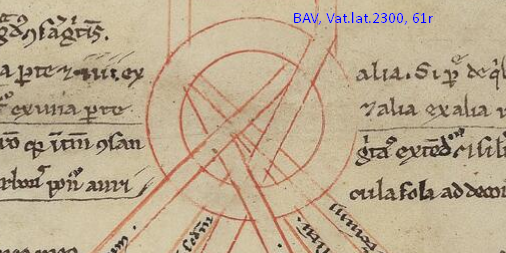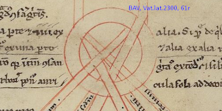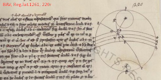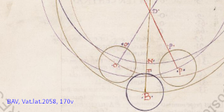 - Vat.lat.2058, Commentary on the Almagest by George Trebizond. Anthony Grafton notes in his Rome Reborn catalog: Trebizond wrote a commentary as long as [his own Latin translation of the Almagest]. The commentary was severely criticized, which resulted in a falling out with Pope Nicholas V. This opulent manuscript was dedicated to Pope Sixtus IV along with Vat.lat.2055 of the translation. [Below is] a large figure of the model for the planet Mercury, shown at its least distance from the earth, with a list of Mercury's parameters and distances: