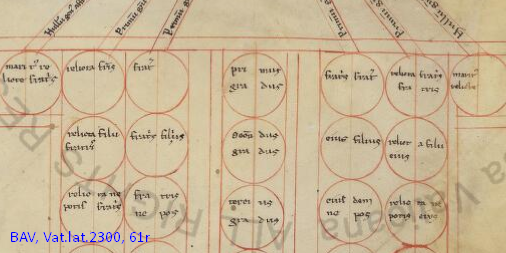 Vincentius Hispanus of Bologna University is apparently the professor who contributed a compound diagram of incestuous marriages at 61r, introducing it as: "Hec conpositio arboris sanguitatis ..."