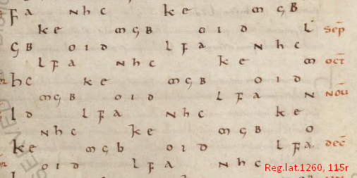 Also new in color is Reg.lat.1260, a binding of two manuscripts believed to be associated with the monastery of Fleury-sur-Loire in France (HT to @monicaMedHist for pointing this out and imaging Beccaria's description). A 10th-century manuscript includes scientific texts such as a glossary of Greek disease names (Incipit: Antrax id est rubor in superficie cutis (see eTK)). And here is its handy tabulation of phases of the moon: