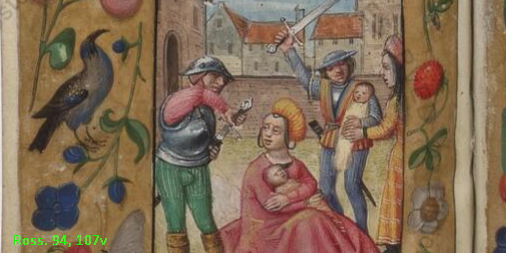 One of the early 16th-century artists worked on the full-page miniatures. Here is an image of the Massacre of the Innocents with gold leaf in the margins: