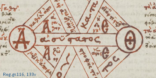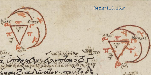 - Reg.gr.116 (Upgraded to HQ), see Pinakes. Contains a logical diagram in a discussion of Aristotle. The Cambridge Intellectual History of Byzantium (eds Anthony Kaldellis, Niketas Siniossoglou) says the explanation of the diagram (first below) in the Prior Analytics is attributed to an otherwise Alousianos: