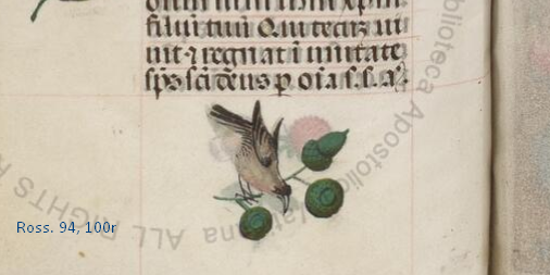 The other two worked on the initials and on the bordures, such as the fanciful bird and the young of a wild boar snatching green acorns below: