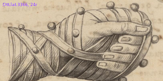 Copies of books 3 and 4 of his antiquarian notes, Ott.lat.3366 and Ott.lat.3367, have just come online at the Vatican Library portal. He was accused in his day of faking records, though controversy continues about whether this was fair. His records are hugely important, since much of what he recorded was later swept away. Here are images of how to armour a fist and of a palace: