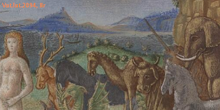 We see the great Greek philosopher seated at a desk as many species wait to tell him their history. Foremost are a specimen man and woman, along with a monkey, dog, ass, deer, pair of sheep, dragon, bear, camel, ox, lion, horse and elephant plus sundry fish and small animals in the foreground.