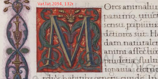 21. Vat.lat.2094 (Upgraded to HQ), Historia animalium, De partibus animalium, De generatione animalium by Aristotle in the Theodore Gaza translation (above). Richly decorated, as in this fine initial M: