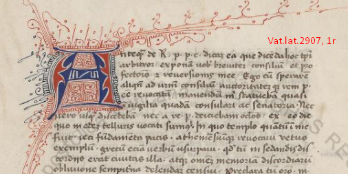 Vat. lat. 2888, 14th C., Marcus Tullius Cicero, De officiis lib. I-III; Vat. lat. 2870, 15th-16th C., Antonio Biaxander (Antonio Flaminio or Flaminio Siculo), collection of poems. #LatestDigitizedManuscripts pic.twitter.com/4kNU2pXjzy - Vat.lat.2907, Cicero, Philippic Orations, also with old lawbooks as endpapers, and this wild overblown initial A:
