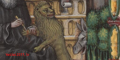 An older legend, first documented in 615 according to Reklams Lexikon, has it that Jerome helped a raging and distressed lion by removing a thorn from its paw. The illumination shows a remarkably calm lion accepting a fix from Jerome's manuscript knife, while the monastery donkey pops its head around the corner to bray. Look up the donkey's story if you haven't read it before. It's quite baroque.