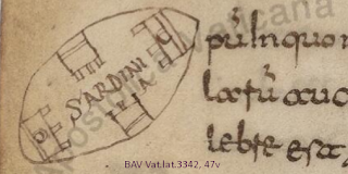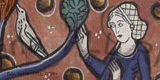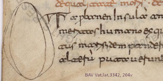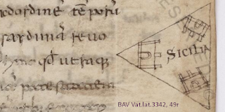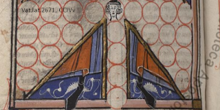 It appears at fol. CCVIIr of Vat.lat.2671, a codex of law which has just been digitized at the Vatican Library. The book is the Summa super titulis decretalium of Goffred de Trano, compiled between 1241 and 1243 and this is a copy from just a generation later, scribed 1270/80, perhaps in Puglia, Italy. The image is part of an arbor, a scheme of forbidden in-law unions.