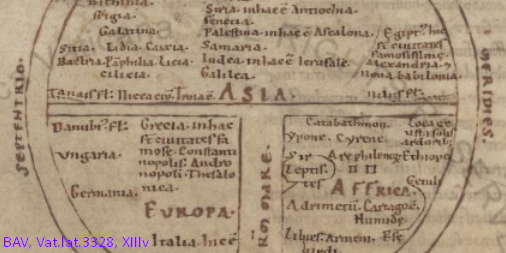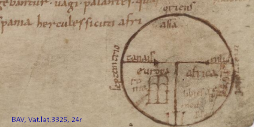 This week, the Vatican Library has digitized a purer example, one of the oldest surviving. It dates from the 10th century, is quite simple, and must be much closer to what a late-antique grammarian doodled on a Sallust text to assist students: a circle marked east at top, with half its surface marked Asia and the rest divided between Europe and Africa: