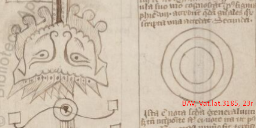 - Vat.lat.3185, the Ars Notoria, a book of magic, which was first mentioned by Michael Scot in 1236 and thus was written earlier. Lots of diagrams in this 14th or 15th century copy: See the eTK. The incipit, Ego Apollonius magister artium merito nuncupatus, apparently refers to the supposed (but most unlikely) author, Apollonius of Tyana