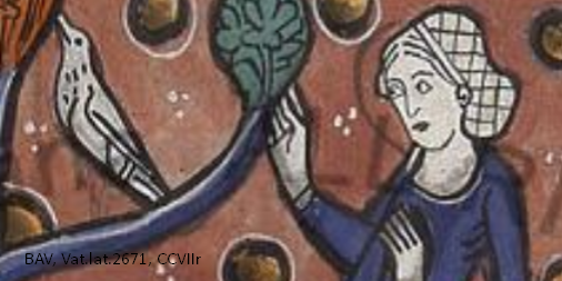 We all like peek-a-boo pictures and this one from the 13th century is quite elegant. It shows a lady shyly peeking at a suitor (out of sight past the bird) and considering the weighty question of whether they are compatible without breaking the rules of incest.