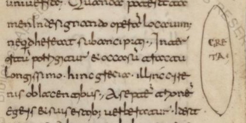 Britain has the scholiast stumped: how on earth is it shaped? Too weird. So he leaves it out, providing the gloss only in his own Carolingian-style handwriting. In the case of Taprobane (modern Sri Lanka), no one knows what is there so he shows it as an empty blob:
